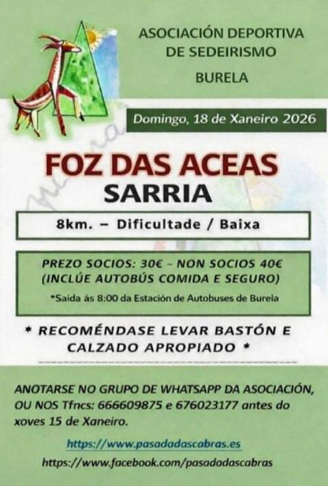 A Asociación Deportiva de Sendeirismo Pasada das Cabras, de Burela, fará a Ruta das Aceas, no municipio lucense de Sarria, este domingo, día 18 de xaneiro. O prezo é de 30 euros para os socios do colectivo organizador e de 40 euros para os que non o son. Inclúe autobús, comida e seguro. A saída será ás 08:00 horas desde a estación de autobuses de Burela.