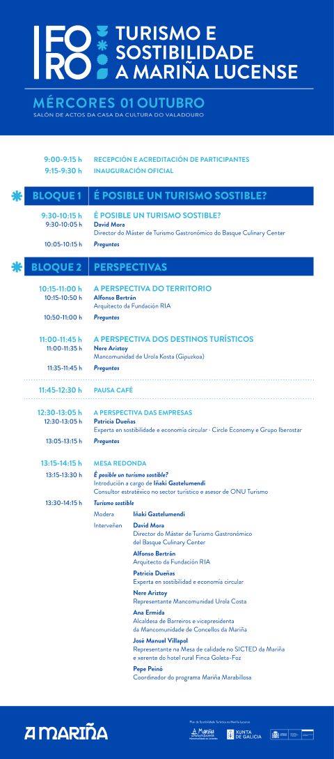 A xestión turística sostible nos territorios será o eixe central do I Foro Turismo e Sostibilidade que terá lugar o vindeiro mércores, 1 de outubro, na Mariña Lucense. A Casa da Cultura do Valadouro acollerá este encontro no que participarán expertos de referencia internacional na xestión de territorios, destinos e empresas, que compartirán as súas experiencias e analizarán xunto cos participantes o alcance da sostibilidade no sector turístico e a contribución que este sector ten no eido económico, social e cultural.