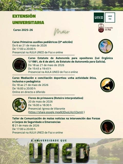 A Aula Universitaria da UNED en Foz presenta a súa programación de extensión universitaria para o mes de maio de 2026, cun total de cinco actividades –tres cursos, un roteiro e unha charla- que combinan formación especializada, divulgación e propostas de carácter social e ambiental.