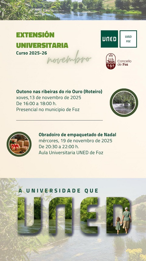 A Aula Universitaria da UNED de Foz vén de presentar a súa programación de actividades para o mes de novembro, cunha oferta que “combina a posta en valor do patrimonio natural da comarca e a aprendizaxe práctica de habilidades creativas”.