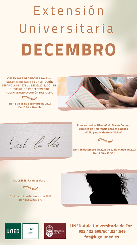 Os interesados en máis información poden poñerse en contacto coa Aula Universitaria de Foz no teléfono 982.133.699, no WhatsApp 604.034.549 ou no correo electrónico foz@lugo.uned.es.