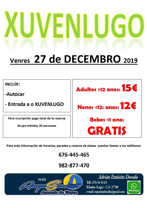A axencia de viaxes Augasantas, de Ribadeo, que dirixe o barreirense Adrián Expósito Dorado, organiza unha excursión a Lugo para visitar o salón de ocio infantil e xuvenil XuvenLugo Será o día 27 deste mes, venres.