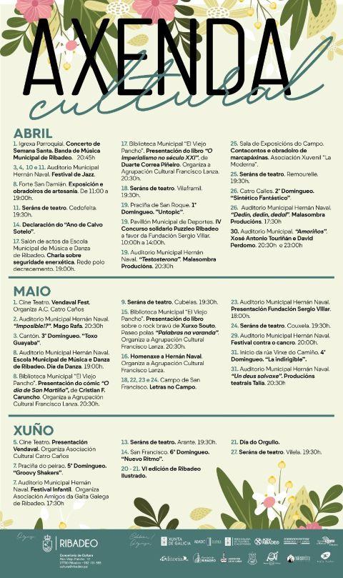 A edil ribadense subliñou que “a axenda inclúe unha trintena de actividades que abranguen disciplinas como a música, o teatro, a literatura, o cinema, a danza ou as artes plásticas, pensadas para todos os públicos e idades. Entre as citas máis destacadas figuran o Festival de Jazz xa celebrado a principios deste mes de abril, concertos do Vendaval Fest en maio ou a sexta edición de Ribadeo Ilustrado en xuño, así como numerosas funcións teatrais e presentacións literarias”.