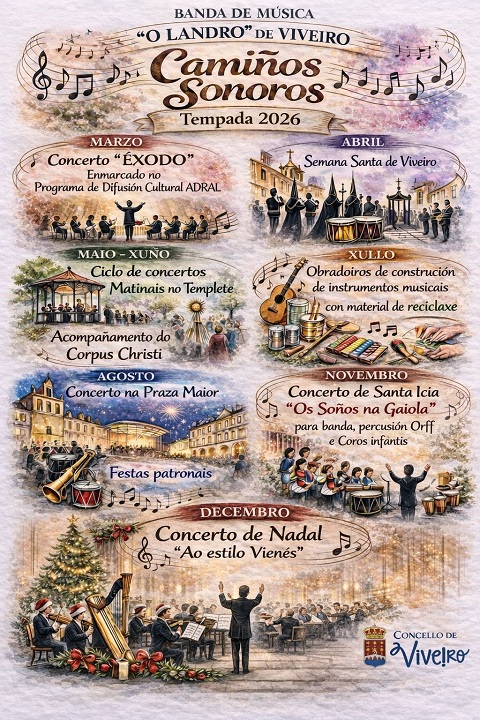 A Banda de Música O Landro, de Viveiro, presentou a tempada 2026 de actividades, que, baixo o título Camiños sonoros, ofrece unha programación que recolle actuacións e propostas formativas entre marzo e decembro.