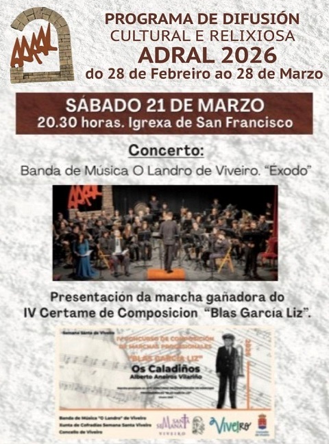 Este sábado, día 21 de marzo, a Banda de Música Landro, de Viveiro, ofrecerá un concerto no que se presentará a marcha gañadora do IV Certame de Composición Blas García Liz, obra titulada Os Caladiños que compuxo Alberto Aneiros Vilariño.