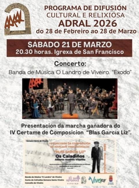 A actuación, titulada Éxodo, será na igrexa de San Francisco ás 20:30 horas. Está incluída no programa de difusión cultural e relixiosa ADRAL 2026, que organiza a Xunta de Cofradías da Semana Santa de Viveiro.