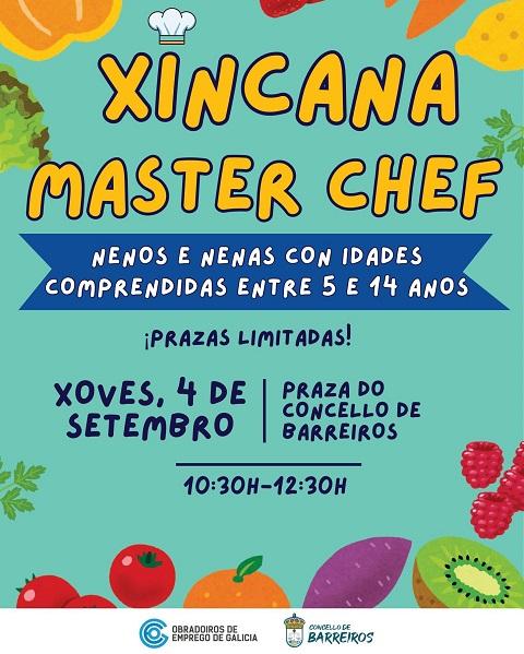 O Concello de Barreiros organiza, a través do obradoiro Máis emprego, unha Xincana Master Chef, coa que as nenas e nenos descubrirán xogando a importancia dunha boa alimentación. A actividade, que está dirixida á cativada de 5 a 14 anos, terá lugar este xoves, 4 de setembro, ás 10:30 horas na Praza do Concello.