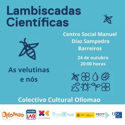 É unha actividade organizada polo Colectivo Cultural Ollomao, de Barreiros, que explica que “As Lambiscadas Científicas son charlas de divulgación científica para público xeral. Teñen unha duración aproximada dunha hora ou hora e media e realízanse a través de asociacións e colectivos locais. Están impulsadas por XuvenLab, en colaboración coa Área de Medio Rural, do Mar e Mocidade da Deputación Provincial de Lugo, dentro do proxecto Ciencia á Feira financiado pola FECYT. Trátase dun proxecto interxeracional, comunitario e itinerante, que leva o coñecemento científico a lugares onde habitualmente non chega, e sempre en diálogo coas realidades locais. E no noso caso escollemos unha problemática que está a orde do día nos últimos anos, afectando a particulares e apicultores de maneira reiterada. Que facer se nos atopamos cunha velutina? Como recoñecer a avespa velutina, que riscos ten e como actuar ante a súa presenza. Analízanse distintos métodos de xestión”.