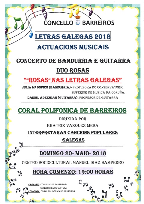 As actividades da Concellería de Cultura de Barreiros con motivo do Día das Letras Galegas continuarán o 20 de maio con dúas actuacións musicais ás 19:00 horas no centro sociocultural Manuel Díaz Sampedro.