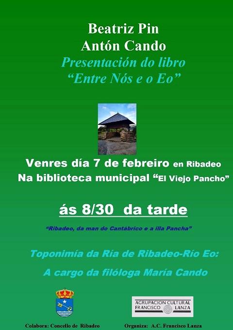 A agrupación cultural Francisco Lanza, de Ribadeo, anuncia que este venres, día 7 de febreiro, ás 20:30 horas na Biblioteca Municipal El Viejo Pancho será presentado o libro titulado Entre nós e o Eo, de Beatriz Pin e Antón Cando.
