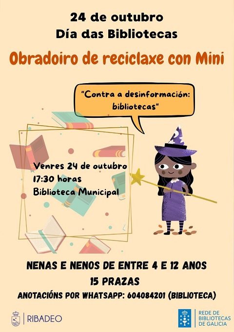 Con motivo da celebración do Día das Bibliotecas, este venres, día 24 de outubro, ás 17:30 horas a Biblioteca Municipal de Ribadeo acollerá o Obradoiro de reciclaxe con Mini, baixo o lema Contra a desinformación: bibliotecas.
