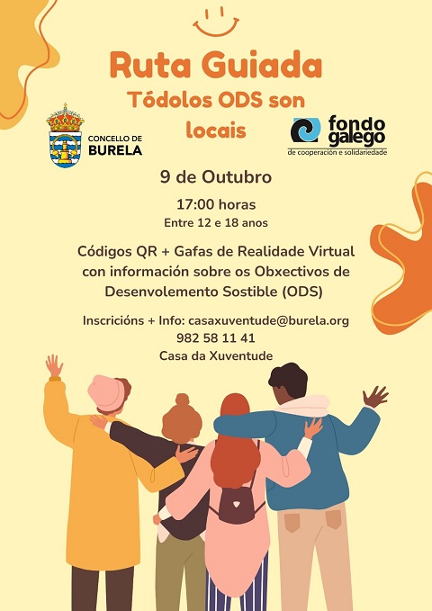 O xoves 9 de outubro ás 17:00 horas Burela acollerá a actividade Ruta Guiada: Tódolos ODS son locais, dirixida a mozas e mozos de entre 12 e 18 anos. A proposta celébrase en colaboración co Fondo Galego de Cooperación e Solidariedade, no marco do programa People & Planet, do que o Concello de Burela forma parte. Froito deste proxecto estableceuse unha ruta pola vila que vincula diferentes espazos cos Obxectivos de Desenvolvemento Sostible.