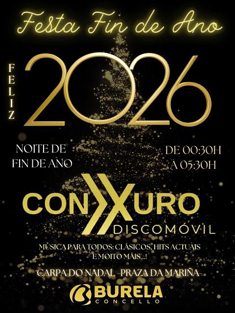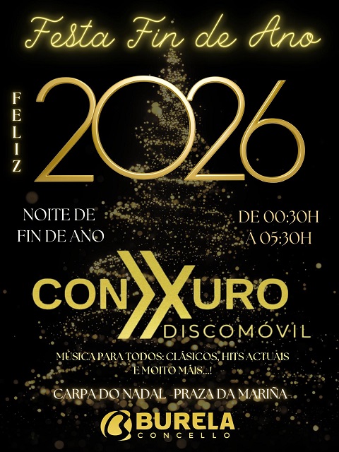 Está organizada polo Concello de Burela, que anuncia: “na noite de fin de ano despediremos o 2025 ao grande. De 00:30 a 05:30 bailaremos con Conxuro Discomóvil, que traerá os mellores éxitos de onte e de hoxe que recibamos o 2026 con festa e moita música. Ven á carpa da praza da Mariña para vivir un comezo de ano inesquecible en Burela!”.