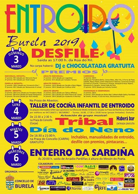 O 3 de marzo darán comezo as actividades de Entroido organizadas polo Concello de Burela. Ás 17:00 horas sairá o desfile desde a rúa do Ril. Haberá premios nas seguintes categorías: Individual Infantil con 90€ para o 1º e 40€ ao 2º; Adulto Individual con 120€ para o 1º e 50€ ao 2º; Parella Infantil con 100€ para o 1º e 60€ ao 2º; Adulto Parella con 150€ ao 1º e 100e ao 2º; Grupo Infantil con 200e para o 1º, 100€ ao 2º e 50 e ao 3º; Adulto Grupo con 250€ ao 1º, 150€ ao 2º e 100€ ao 3º; e Carrozas e Charangas e Comparsas con 500€ para o 1º e 250€ ao 2º, en ambos casos.