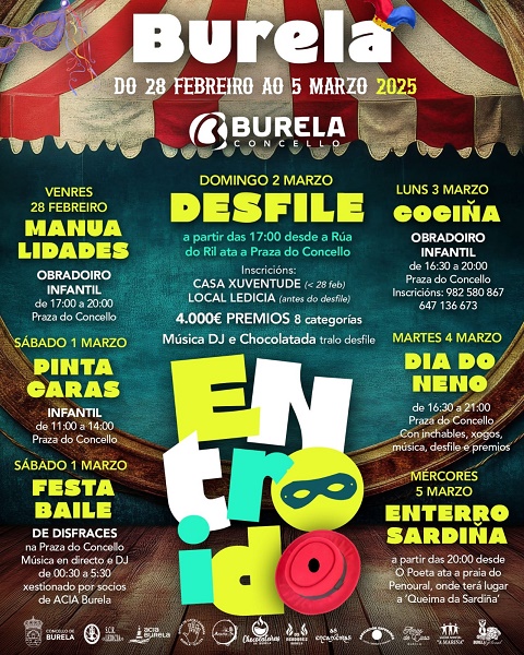Desde o Concello de Burela animan a toda a veciñanza a participar nestas festas e a saír á rúa para “encher o pobo de cor, diversión e tradición”. A concelleira de Festexos, Patricia Eijo, destaca que teñen preparada!unha programación variada para que todas as persoas, desde os máis pequenos ata os maiores, poidan desfrutar do Entroido en Burela”.