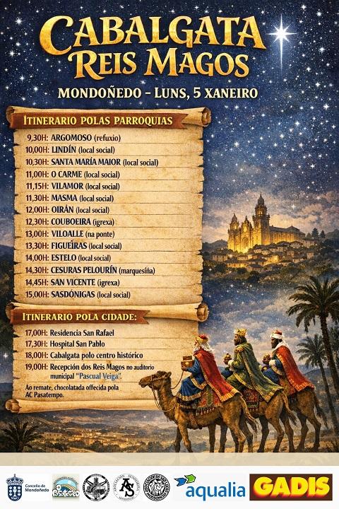 A Cabalgata dos Reis Magos en Mondoñedo, que se celebrará o luns 5 de xaneiro, comezará na refuxio de Argomoso ás 09:30 horas. O percorrido continuará por Lindín, Santa María Maior, O Carme, Vilamor, Masma, Oirán, Couboeira, Viloalle, Figueiras, Estelos, Cesuras Pelourín, San Vicente e Sasdónigas, a onde está previsto que cheguen ás 15:00 horas.