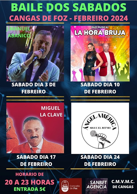 Cangas de Foz acollerá catro bailes con actuacións musicais en directo os catro sábados de febreiro, organizados polo Concello de Foz. Son de 20:00 a 23:00 horas e o prezo da entrada é de 5 euros.