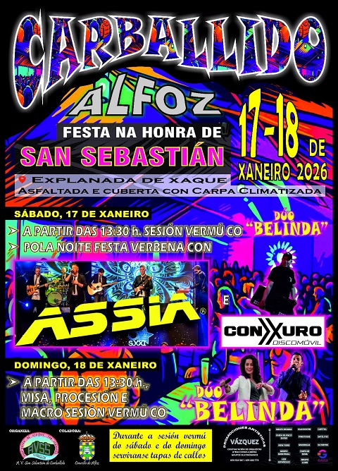 En canto á programación explica que o sábado 17 de xaneiro haberá sesión vermú “e moito baile co dúo da casa ao que tanto cariño lle temos, dúo Belinda, Haberá tapas de callos para acompañalas consumicións. E festa verbena co grupo Assia; teredes ocasión de disfrutar de verdadeira música en directo cun dos grandes grupos da verbena asturiana. A calidade musical deste grupo, con escasas visitas á nosa zona, estamos seguros que vos vai a sorprender. E DJ Pablo Conxuro, o noso DJ de cabeceira que nunca defrauda. Desta vez lama non vamos facer que a explanada ten asfalto, pero vaise gastar suela … E o domingo 18 de xaneiro teremos misa, procesión e macro sesión vermú fin de festa de novo co animadísimo dúo Belinda. Gastaremos a enerxía que nos quede co variado e divertido repertorio destes artistazos. Imos estirar a sesión vermú para todos aqueles que non vos gusta recollervos cedo. Despediremos o San Sebastián 2026 como está mandado! Tamén volveremos repartir tapas de callos para acompañalas consumicións”.