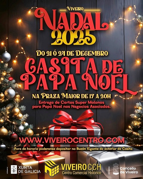 A campaña de Nadal do Centro Comercial Histórico de Viveiro continúa nestes días cunha morea de actividades e sorteos: “á decoración dos negocios con guirnaldas navideñas, alfombras de vinilo vermello e árbores de luces leds sumamos nestes días máis actividades. Continuamos co sorteo do Calendario de Advento do Comercio local, un exitazo de participación que ata o momento leva repartidos 19 premios entre cestas de Nadal, cestas doces, xamóns, cestas de produtos de porco celta, caixas de peixes e mariscos, tratamentos de beleza e benestar e décimos de lotería. Cada día un premio valorado en 100 euros. E continua ata o día 24.  A Casita de Papá Noel, instalada na Praza Maior estará funcionando en horario de 17:00 a 20:00 horas do 21 ó 24 de decembro”.