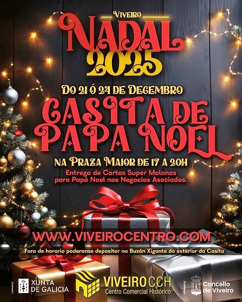 Ademais o CCHV anuncia que “na tarde do día 24 Papá Noel sairá en cabalgata ás 17 horas dende a explanada da Variante ata chegar á Praza Maior, onde recollerá as cartas e atenderá as peticións dos máis pequenos.  Os negocios asociados ó CCHV están a repartir 8.000 cartas entre os nenos para que lle poidan escribir a Papá Noel lembrando o importante que é mercar os agasallos na vila. Os Elfos tamén lle votarán unha man a Papá Noel para recoller tódalas cartas e atender as peticións dos máis pequenos. Pero no caso de non poder chegar a tempo, este ano ó carón da Casita colocouse tamén un buzón xigante, onde os nenos poden depositar as súas cartas no horario no que a Casita non estea aberta. Continuamos así un clásico do Nadal de Viveiro, ó que acoden moitos nenos da comarca cheos de ilusión. A última semana do ano teremos un Obradoiro de Música Electrónica con DJ Karras Martinez, unha actividade que se puxo en marcha o ano pasado e tivo tanto éxito de convocatoria que este ano repetimos de novo. Animamos ós mozos a sumerxirse no mundo da música electrónica con este obradoiro impartido polo DJ e produtor Karras Martínez. Aprender técnicas de iniciación á mestura nun ambiente creativo e participativo”.