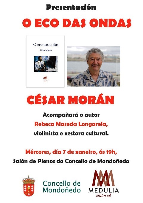 O profesor, escritor e músico César Morán Fraga presentará a súa obra titulada O eco das ondas. Caminhos arredor da música, libro publicado o pasado ano 2025 pola editoral Medulia. O acto será o mércores 7 de xaneiro ás 19:00 horas no salón de plenos do Concello de Mondoñedo.