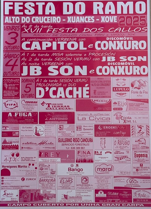 Esta fin de semana -venres 3, sábado 4 e domingo 5 de outubro- vaise celebrar no Cruceiro, na parroquia de Xuances (Xove), a Festa do Ramo, coñecida tamén pola súa cita gastronómica na que enxalzan os callos. E así empeza a programación o venres 3 de outubro, coa XVII Festa dos Callos, acompañados pola orquestra Capitol e disco móbil Conxuro. Continua a festa o sábado coa sesión vermú da man do Grupo JB Son e verbena pola noite co grupo JB Son e disco móbil Conxuro e rematan o domingo cunha sesión vermú prolongada amenizada polo dúo D’Caché.