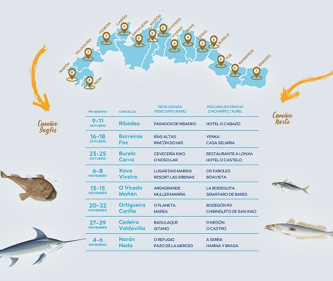 Este fin de semana se celebra la tercera etapa del “Camiño Gastronómico do Mar”, una serie de jornadas gastronómicas que están recorriendo la costa norte de Galicia ofreciendo recetas de cuatro de las especies pesqueras más representativos de la lonja de Burela: merluza del pincho, pez espada, jurel (chicharro) y rape.