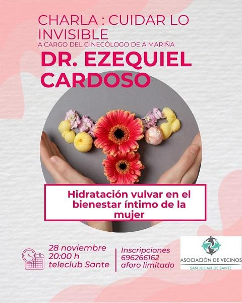 El ginecólogo Ezequiel Cardoso ofrecerá una charla en el Teleclub de Sante (Trabada) este viernes, día 28 de noviembre, a las 20:00 horas. Tratará sobre hidratación vulvar en el bienestar íntimo de la mujer.