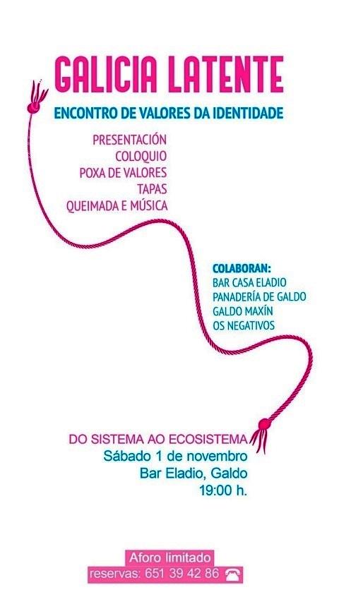 “Colaboran Galdo Maxín, Casa Eladio, Panadería de Galdo e Os Negativos. Ao rematar, gozaremos de música tradicional e despediremos a xornada cunha queimada con conxuro”, anuncian os organizadores desta actividade, que engaden que é “un encontro para recoñecérmonos, dialogar e fortalecer o que nos une: a identidade galega”.