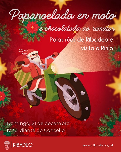 O Concello de Ribadeo anuncia que este domingo, día 21 de decembro, as rúas do concello “volverán encherse de ilusión coa tradicional Papanoelada en moto, que sairá ás 17:30 horas do Cantón dos Moreno. O percorrido incluirá unha visita a Rinlo e, posteriormente, darase un paseo polas rúas de Ribadeo. Un plan perfecto para vivir a maxia do Nadal con ritmo e alegría! E ao finalizar haberá chocolatada para compartir o mellor sabor do Nadal”.