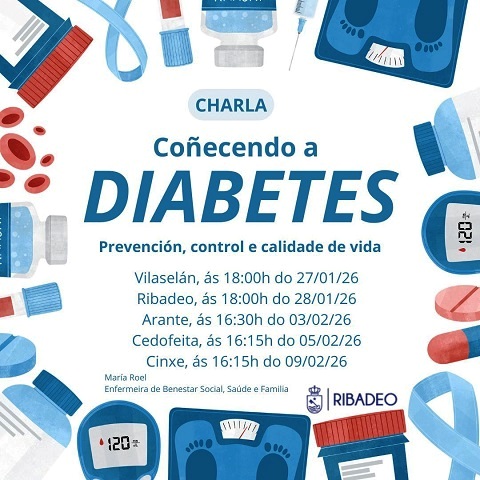 O Concello de Ribadeo retoma as charlas de saúde do programa Preto de Ti, “reafirmando así a súa aposta pola promoción e prevención da saúde entre a poboación. Esta nova edición estará dedicada á prevención, control e mellora da calidade de vida das persoas que conviven coa diabetes, unha enfermidade moi prevalente e que afecta a unha porcentaxe importante da poboación, especialmente a maiores. A través destas sesións, ofrecerase información clara e novos coñecementos para axudar á veciñanza a comprender mellor a diabetes e aprender que, con pequenos coidados diarios, é posible manter unha boa saúde e unha boa calidade de vida”.
