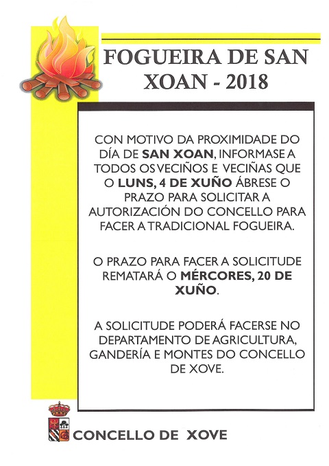 A Concellería de Agricultura, Gandeiría e Montes de Xove informa da apertura do prazo para solicitar autorización para todos aqueles que queiran facer a tradicional fogueira do San Xoán.
