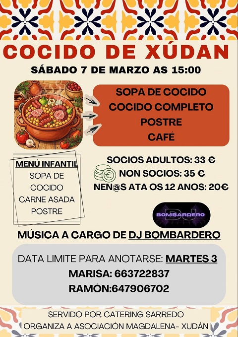 A asociación veciñal A Magdalena, da parroquia de Xudán (A Pontenova), organiza unha comida de cocido paro día 7 de marzo, sábado, ás 15:00 horas. Haberá música a cargo de DJ Bombardero.