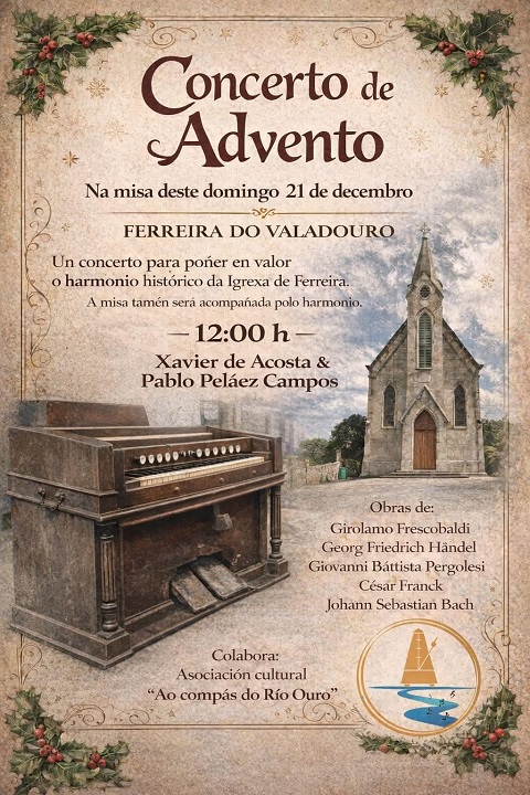 Nesta actividade colabora a asociación cultural Ao compás do río Ouro, que anuncia: “un concerto de Advento para poñer en valor o harmonio histórico da igrexa de Ferreira de O Valadouro. Grazas a Pablo Peláez e Xavier de Acosta, este harmonio foi recuperado. Este domingo 21 poderedes disfrutar dun concerto diferente”.