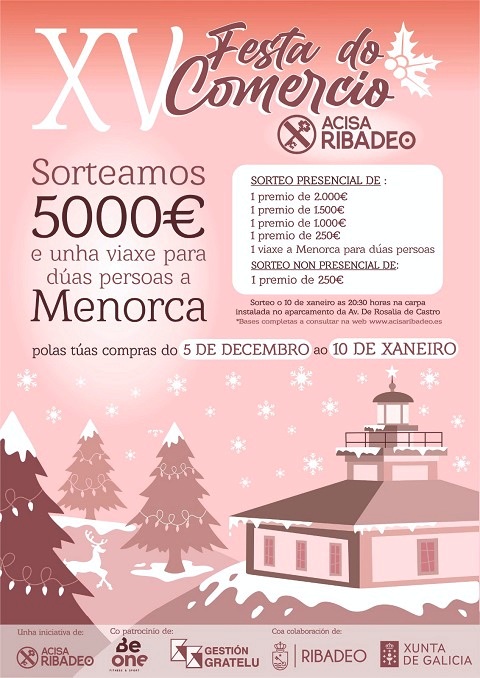 Este sábado, día 10 de xaneiro, terá lugar a XV Festa do Comercio de Acisa Ribadeo, que repartirá 5.000 euros premios e unha viaxe a Menorca para dúas persoas. O sorteo será nas carpas instaladas na Avenida Rosalía de Castro a partir das 20:30 horas.