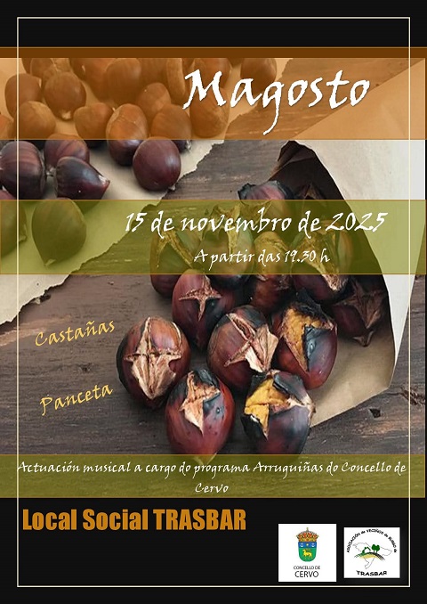 A Asociación de Veciños do Burgo de Trasbar, no municipio de Cervo, organiza un magosto que terá lugar no seu local social este sábado, día 15 de novembro, desde as 19:30 horas.