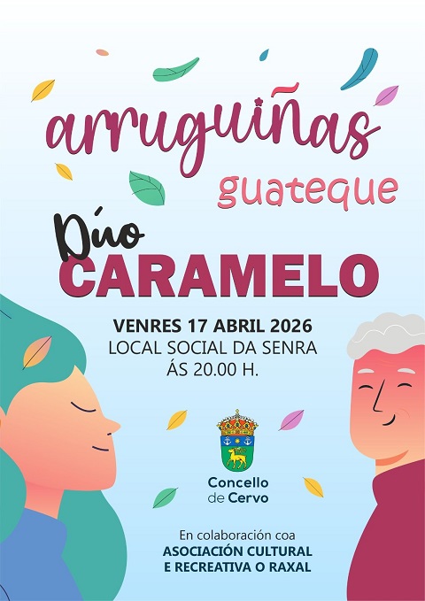 Este venres, día 17 de abril, o Concello de Cervo organiza un novo Guateque de Arruguiñas no Local Social da Senra desde as 20:00 horas. Actuará o dúo Caramelo.
