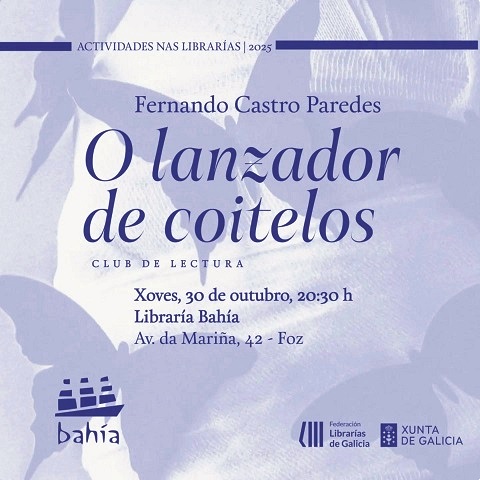 Este xoves, día 30 de outubro, ás 20:30 horas vai estar na Libraría Bahía, de Foz, o escritor Fernando Castro Paredes para falar sobre a súa última novela, O lanzador de coitelos, coa que gañou o premio Galaxia 75 aniversario, “un premio puntual có que a editorial Galaxia quixo celebrar unha efemérides tan importante. Trátase dunha novela de gran talento literario, que cós recursos da novela negra indaga sobre a identidade, a arte e as paixóns dos seres humanos” explica Libraría Bahía, que engade: “Fernando Castro naceu na veciña Tapia de Casariego, é dramaturgo e actor; antes de esta novela, ademais de obras de teatro, tiña escrito un libro de relatos, titulado Entomoloxía para misioneiros”.