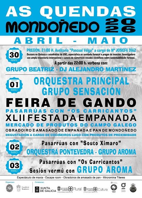 A Vicepresidencia da Deputación de Lugo anunciou que “a deputada de Cultura, Iria Castro, participou na presentación das Quendas. O acto celebrouse a carón da Fonte Vella coa participación de representantes do Concello de Mondoñedo e da Xunta de Galicia e membros da organización, que desvelaron as actividades que se desenvolverán ao longo das catro xornadas: desde a feira do gando e o mercado de produtos de temporada ata o obradoiro de amasado artesán da Festa da Empanada ou os espectáculos infantís e de maxia, a animación musical na rúa e a verbena. A profesora da USC María Josefa Lombardero Díaz, referente internacional na investigación forestal, será a pregoeira das festas”.