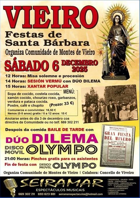 O Concello de Viveiro anuncia: “volve unha das celebracións máis queridas da nosa parroquia. O sábado 6 de decembro Vieiro encherase de música, tradición, boa comida e moito ambiente. Procesión, sesión vermú, xantar popular, baile de tarde e un fin de festa por todo o alto! Un día completo para gozar en comunidade, pensado para todas as idades e organizado coa ilusión de sempre pola Comunidade de Montes de Vieiro”.