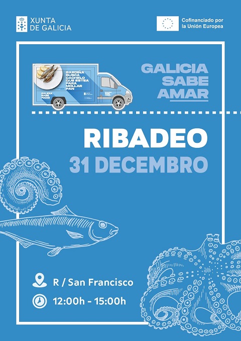 A foodtruck Galicia Sabe Amar estará este mércores, día 31 de decembro, en Ribadeo enchendo de sabor o último día do ano. Ofrecerá degustacións gratuítas de produtos do mar entre as 12 e as 15:00 horas na rúa San Francisco.