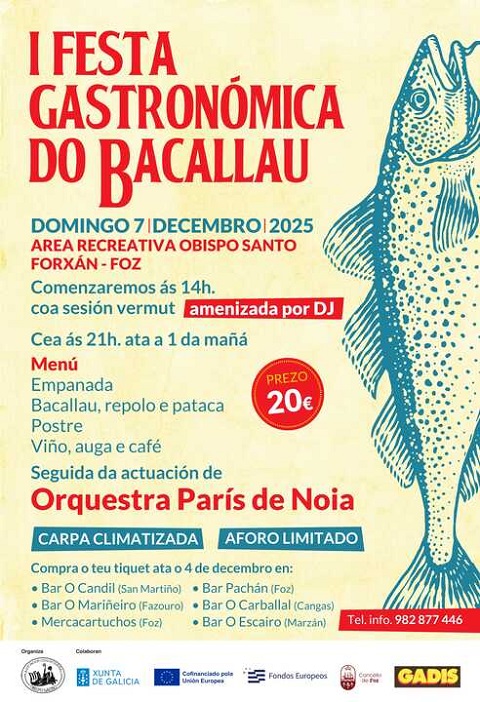A Xunta de Galicia anuncia que apoia a I Festa do Bacallau organizada pola asociación Bispo Santo, de Foz, que se celebrará este domingo, día 7 de decembro, na área recreativa do Bispo Santo, en Forxán.
