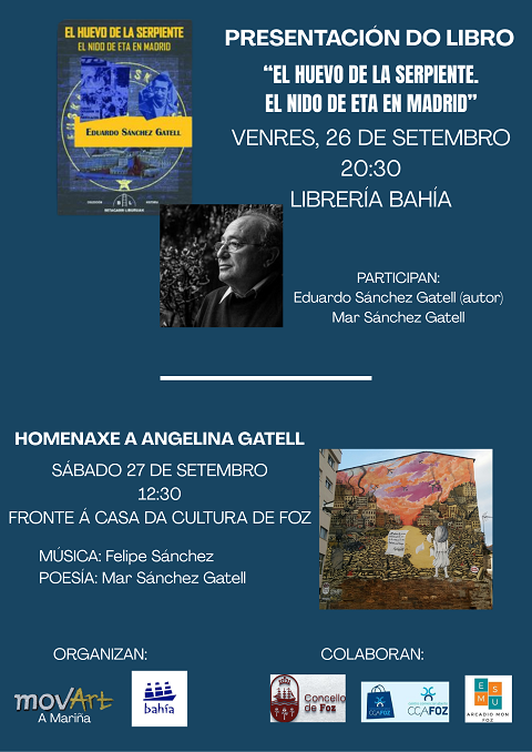 A asociación Movemento Artístico da Mariña (Movart- A Mariña) e a Librería Bahía de Foz organizan este venres, día 26 de setembro, ás 20:30 horas, na referida librería, a presentación do libro El huevo de la serpiente. El nido de ETA en Madrid, de Eduardo Sánchez Gatell, publicado pola editorial Betagarri Liburuak.