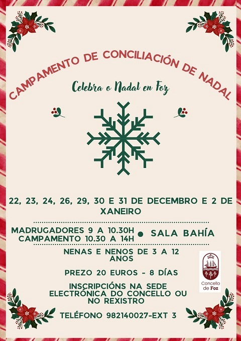 Este Nadal a novidade en Foz é o campamento de conciliación de Nadal. Terá lugar os días 22, 23, 24, 26, 29, 30, 31 de decembro e 2 de xaneiro na Sala Bahía. A concelleira de Cultura, Inés López Couto, anuncia que “o campamento terá horario de madrugadores dende ás 9.00 ata as 10.30 horas e o horario do campamento será de 10.30 a 14.00 horas. Está pensado para nenos de 3 a 12 anos e nel poderán realizar diferentes actividades, como obradoiros, xogos, etcétera. O custe dos 8 días é de 20 euros. A inscrición está aberta ata este xoves 18 ou finalización de prazas, que serán outorgadas por orde de entrada. Esta pode realizarse na sede electrónica do concello de Foz, no apartado Trámites destacados.-Campamento de Nadal de Foz 2025-2026 ou no rexistro do Concello”.