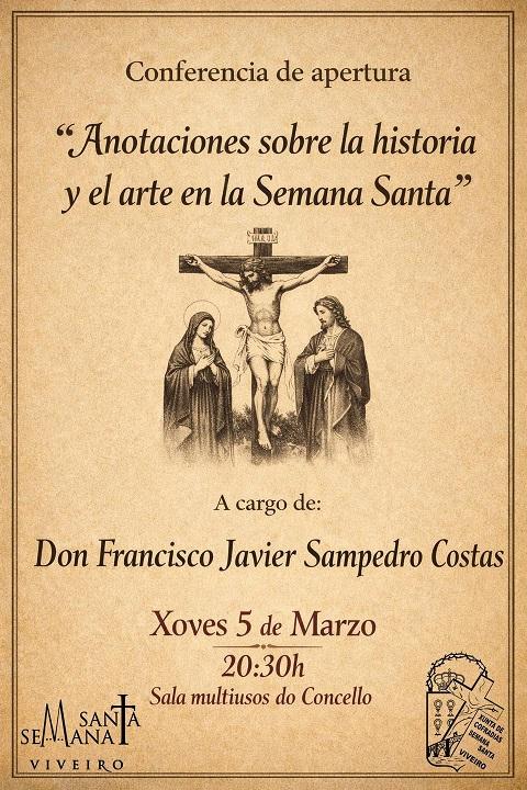 Francisco Javier Sampedro Costas ofrecerá en Viveiro la conferencia titulada Anotaciones sobre la historia y el arte en la Semana Santa. Será este jueves, día 5 de marzo, a las 20:30 horas en la Sala Multiusos del Concello.