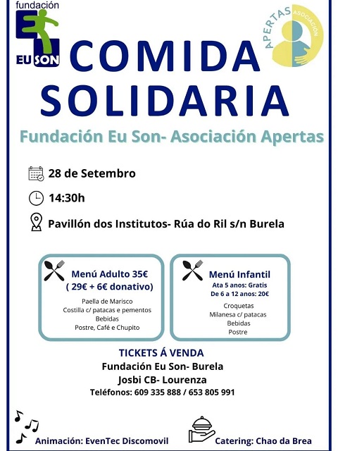 A Fundación Eu Son e a Asociación Apertas, dedicadas á Protección de Persoas con Discapacidade Intelectual en Burela, organizan unha comida solidaria este domingo, día 28 de setembro. Será no Pavillón dos Institutos, que está na rúa do Ril, desde as 14:30 horas.