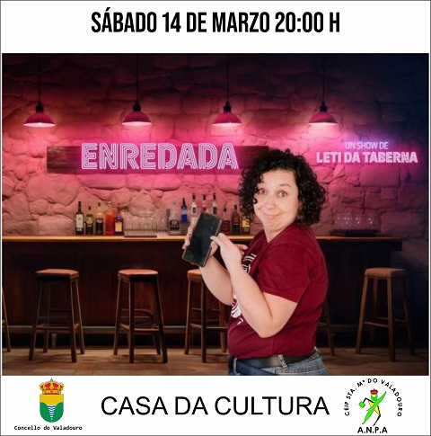 A humorista Leti da Taberna presentará no Valadouro o seu espectáculo titulado Enredada. Será este sábado, día 14 de marzo, ás 20:00 horas na Casa da Cultura.