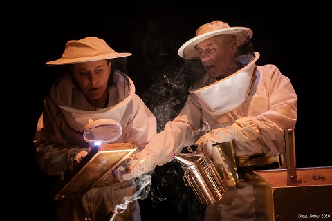 A montaxe amosa dúas tramas, dous científicos que no 2173 tratan de crear sinteticamente unha abella a partir do último tarro de mel que se conserva e dous irmáns que se reencontran trala morte da súa nai para xestionar as pertenzas familiares. As dúas se complementan con outros textos e con escenas de movemento escénico nun espazo creado a partir do universo das abellas e composto por colmeas e outro material de apicultura.