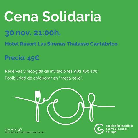 La Asociación Española Contra el Cáncer organiza una cena solidaria en Viveiro el día 30 de noviembre, sábado. Será en el Hotel Resort Las Sirenas Talaso Cantábrico a las 21:00 horas.