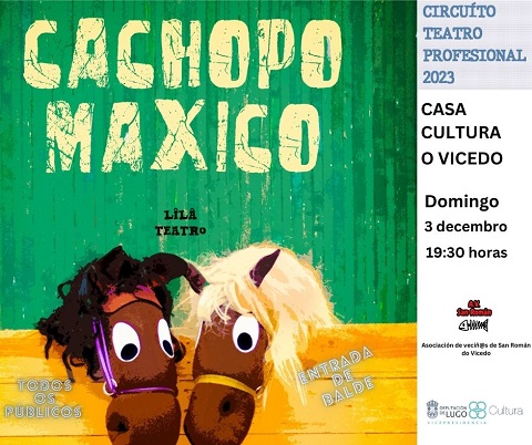 Este domingo, 3 de decembro ás 19:30 horas na Casa da Cultura do Vicedo a compañía Lilá Teatro representará a obra "Cachopo Máxico", que é para todos os públicos e con entrada de balde. Esta actividade, organizada pola Asociación de Veciñ@s de San Román do Vicedo, encádrase dentro do Circuíto de Teatro Profesional 2023 da Vicepresidencia da Deputación de Lugo.